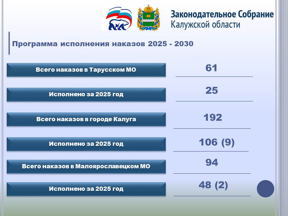В Тарусском округе в программу вошел 61 наказ, причём 25 из них были выполнены в прошлом году. Среди ключевых реализованных проектов: